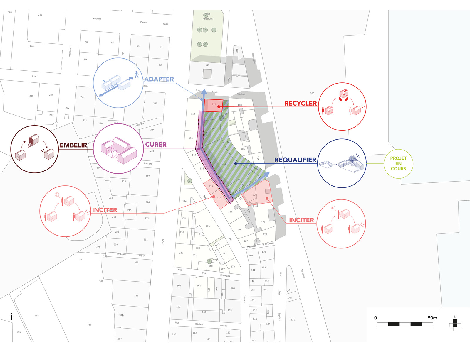 Mobilisée autour d’un projet de réinvestissement de son centre ancien, la municipalité d’Ajaccio s’est construite à travers un urbanisme « d’opportunité » entrainant un soudain développement en périphérie (migration progressive d’équipements, développement de programmes collectifs ou dispersion de l’habitat individuel). Dans un contexte de marché immobilier particulièrement tendu et de concurrence agressive avec le parc locatif touristique, le centre ancien d’Ajaccio connait des déséquilibres sociodémographiques et immobiliers aïgus.